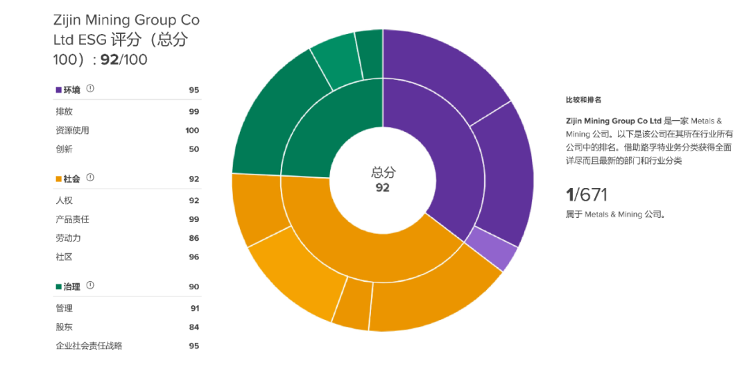 近日,全球最主要的評級公司之一路孚特ESG更新了紫金礦業的最新ESG評分,紫金礦業分數進一步提升至92分,位列全球671家金屬與采礦行業公司第一名。