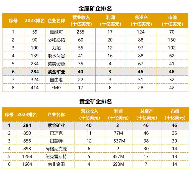 在上榜的全球金屬礦企中,紫金礦業進入第6位,較去年前進1位。全球金屬礦企前六名為:嘉能可(59)、必和必拓(90)、力拓(100)、淡水河穀(139)、英美資源(234)、紫金礦業(284)。其中,嘉能可上升32位。在上榜的全球黃金企業中,紫金礦業繼續保持第1位,第2、3位分別是巴理克(850)、紐蒙特(856)。