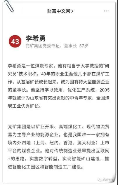 兗礦集團董事長李希勇上榜2020年中國最具影響力50位商界領袖