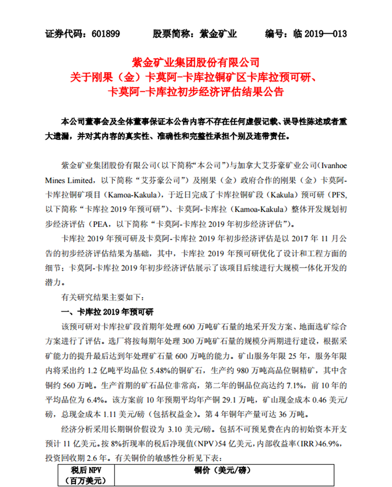 公告稱,卡庫拉 2019 年預可研估算概略級別的銅礦石儲量 1.2 億噸,平均銅品位 5.48%,銅金屬量 656 萬噸。