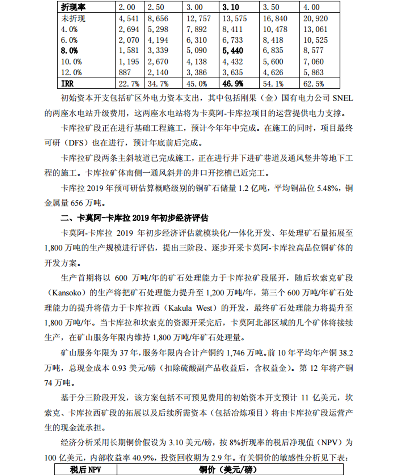公告稱,卡庫拉 2019 年預可研對卡庫拉礦段首期年處理 600 萬噸礦石量的地采開發方案、地麵選礦綜合方案進行了評估。選廠將按每期年處理 300 萬噸礦石量的規模分兩期進行建設,根據采礦能力的提升最後達到年處理礦石量 600 萬噸的能力。礦山服務年限 25 年,服務年限內將采出約 1.2 億噸平均品位 5.48%的銅礦石,生產約 980 萬噸高品位銅精礦,其中含銅約 560 萬噸。生產首期的礦石品位非常高,第二年的銅品位高達約 7.1%,前 10 年的平均品位為 6.4%。該方案前 10 年預期平均年產銅 29.1 萬噸,礦山現金成本 0.46 美元/磅,總現金成本 1.11 美元/磅(包括權益金)。第 4 年銅年產量可達 36 萬噸。