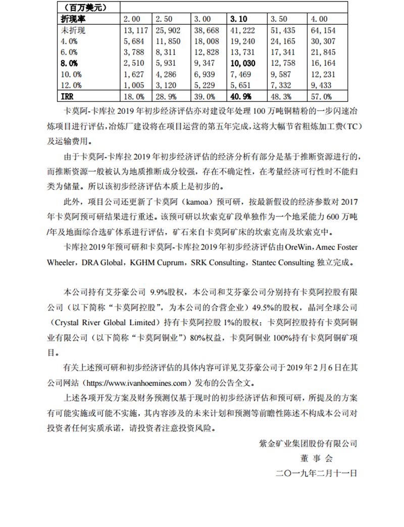 經濟分析采用長期銅價假設為 3.10 美元/磅,按 8%折現率的稅後淨現值(NPV)為 100 億美元,內部收益率 40.9%,投資回收期為 2.9 年。