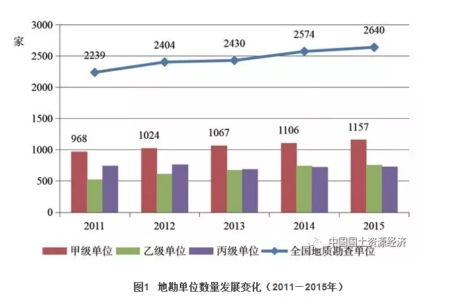 1988年地礦部成立地質勘查管理司,負責地質勘查行業管理工作;國土資源部成立之後延續並充實該職能。地質勘查行業管理成效顯著,主要體現在規劃、資質、標準和統計四個方麵。全國地質勘查規劃是目前唯一的一部行業發展規劃,統計有地質勘查通報、全國局級地勘單位工作報告等。以2002年溫家寶總理講話為契機,國務院和國土資源部相繼出台了關於加強地質工作的決定、加強地質勘查行業管理的通知、全國地質勘查規劃等重要文件,地質勘查行業發展步入快車道。2009年地質找礦改革發展大討論,催生了地質找礦新機製和地質找礦突破戰略行動。公益性地質工作全麵展開,地調係統隊伍精幹,經費充足,成果豐碩;商業性地質工作迎來“黃金十年”,地勘單位“戴帽走路”,開展“兩個市場,兩種資源”,地勘隊伍逐步發展壯大。圖1為2011-2015年地勘單位數量發展變化情況。截至2015年底,全國共有地勘資質單位2640家:資質等級方麵,擁有甲級資質的有1157家,占地勘單位總數量的44%;資質專業方麵,擁有固體礦產勘查資質的單位有1936家,占地勘單位總數量的73%;資質數量方麵,全國地勘單位擁有各項資質7595個,平均每個地勘單位擁有2.9項資質。