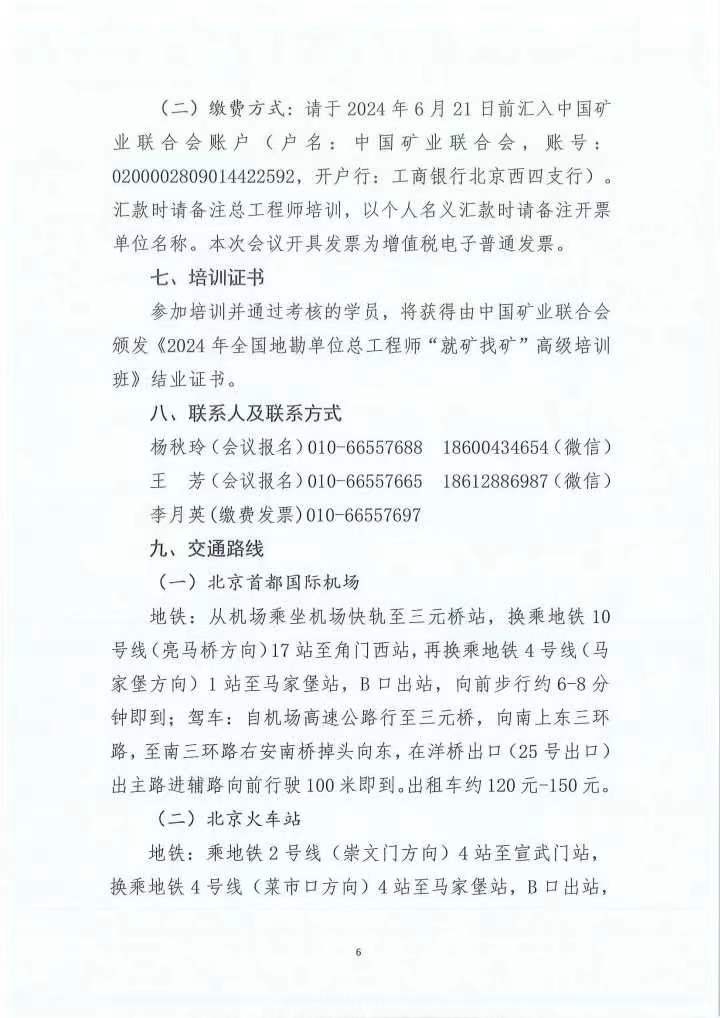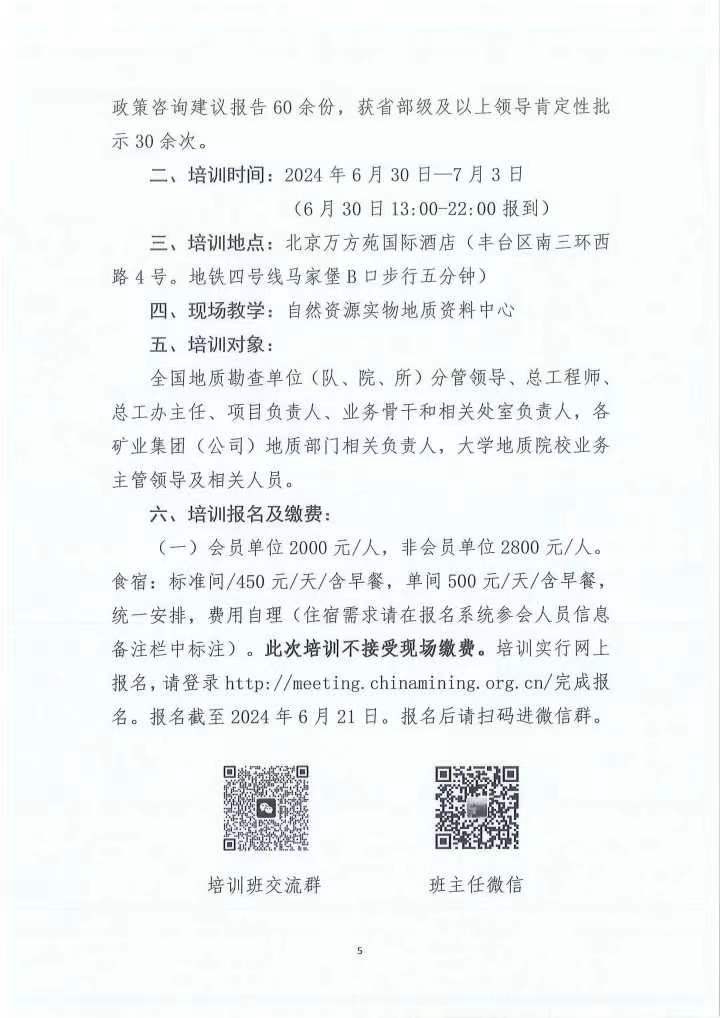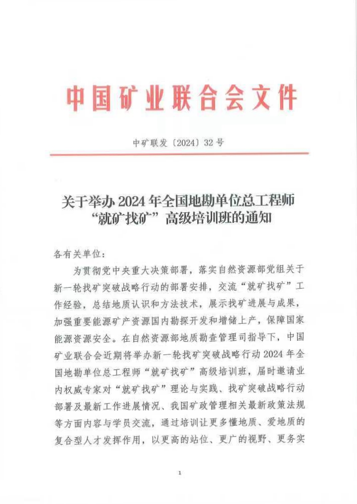 2024年全國地勘單位總工程師“就礦找礦”高級培訓班將於6月30日—7月3日在北京舉行。培訓對象為全國地質勘查單位(隊、院、所)分管領導、總工程師、總工辦主任、項目負責人、業務骨幹和相關處室負責人,各礦業集團(公司)地質部門相關負責人,大學地質院校業務主管領導及相關人員。
