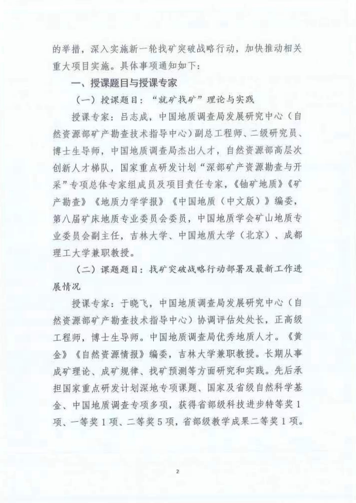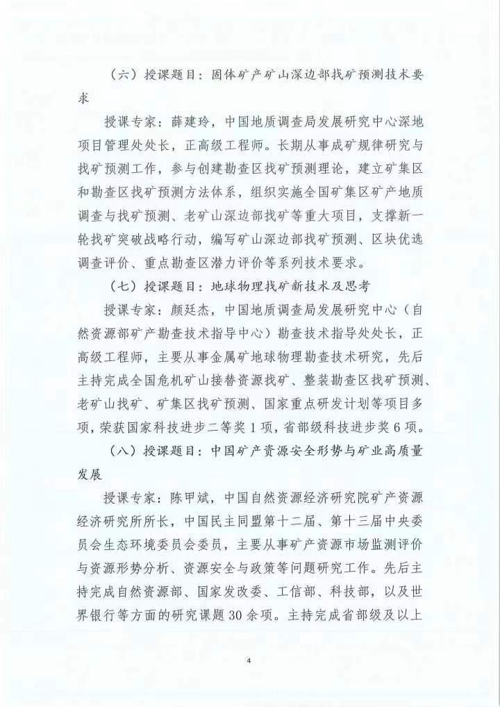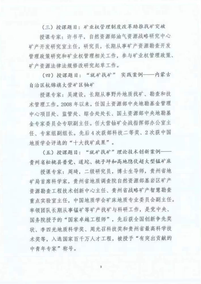 授課題目包括:“就礦找礦”理論與實踐;找礦突破戰略行動部署及最新工作進展情況;礦業權管理製度改革助推找礦突破;“就礦找礦” 實踐案例——內蒙古自治區杭錦旗大營礦區鈾礦;“就礦找礦”理論技術創新案例——貴州省鬆桃縣普覺、道坨、桃子坪和高地隱伏超大型錳礦床;固體礦產礦山深邊部找礦預測技術要求;地球物理找礦新技術及思考;中國礦產資源安全形勢與礦業高質量發展。