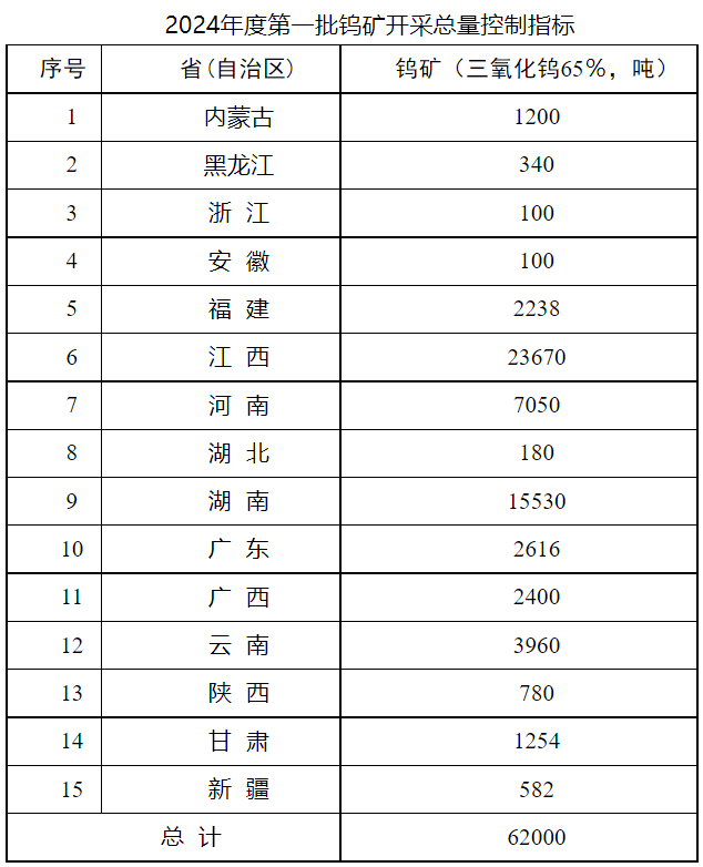 一、2024年度第一批鎢礦(三氧化鎢含量65%,下同)開采總量控製指標62000噸,具體分配見附件。