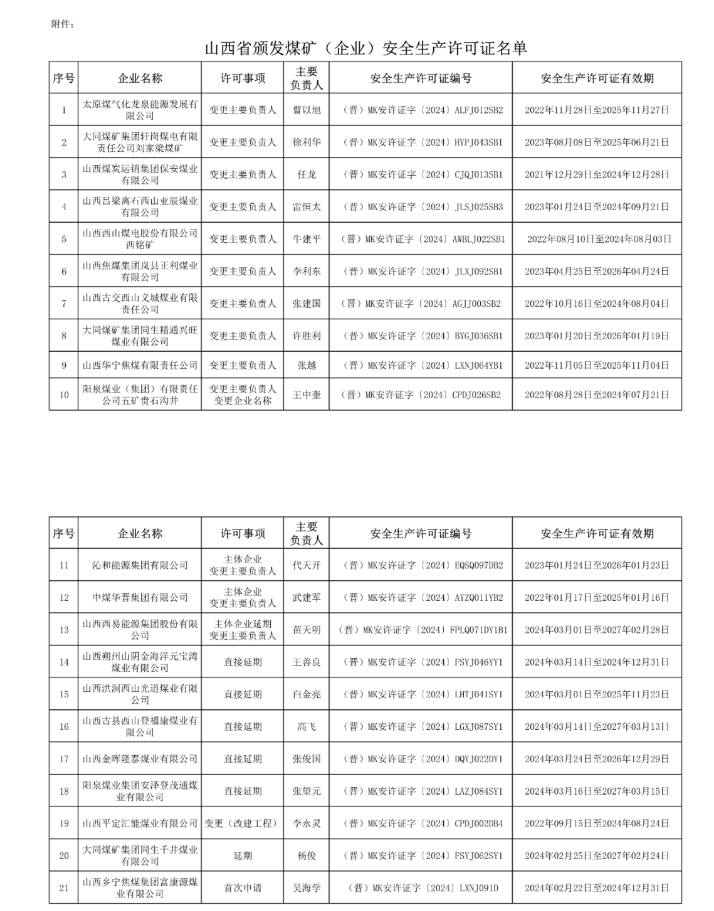 經研究,按照有關規定,為太原煤氣化龍泉能源發展有限公司等21座煤礦(企業)頒發安全生產許可證,現進行公告。