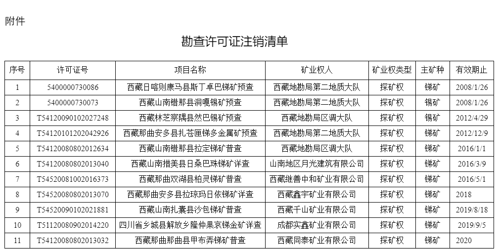 西藏日喀則康馬縣斯丁卓巴銻礦預查等11個勘查許可證在有效期屆滿前,礦業權人未按規定申請辦理延續登記手續,根據《礦產資源勘查區塊登記管理辦法》(國務院令第240號)第十條、《自然資源部關於進一步完善礦產資源勘查開采登記管理的通知》(自然資規〔2023〕4號)第十八條,現予以注銷。特此公告。