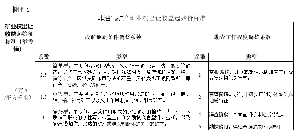 一、非油氣礦產(不含稀土、放射性礦產)礦業權出讓收益起始價標準主要依據礦業權麵積,綜合考慮成礦條件、勘查程度等因素確定。省級自然資源主管部門、財政部門可結合本地區實際情況,在附件1的基礎上,對礦業權出讓收益起始價標準(參考值)進行調整,調整幅度不超過10%。具體執行標準報省級人民政府同意後公布實施。標準製定後,原則上不再調整。各地在製定標準時應充分考慮促進探礦權出讓市場活躍,降低探礦權取得門檻,不與資源儲量掛鉤。稀土、放射性礦產礦業權出讓收益起始價標準按附件1執行。