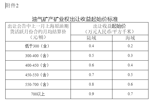 二、油氣礦產礦業權出讓收益起始價標準按附件2執行。