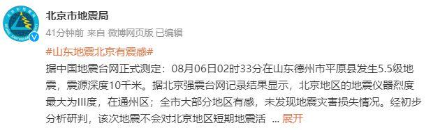 經中國地震台網正式測定,8月6日2時33分,在山東省德州市平原縣發生5.5級地震,震源深度10千米,多地震感明顯。