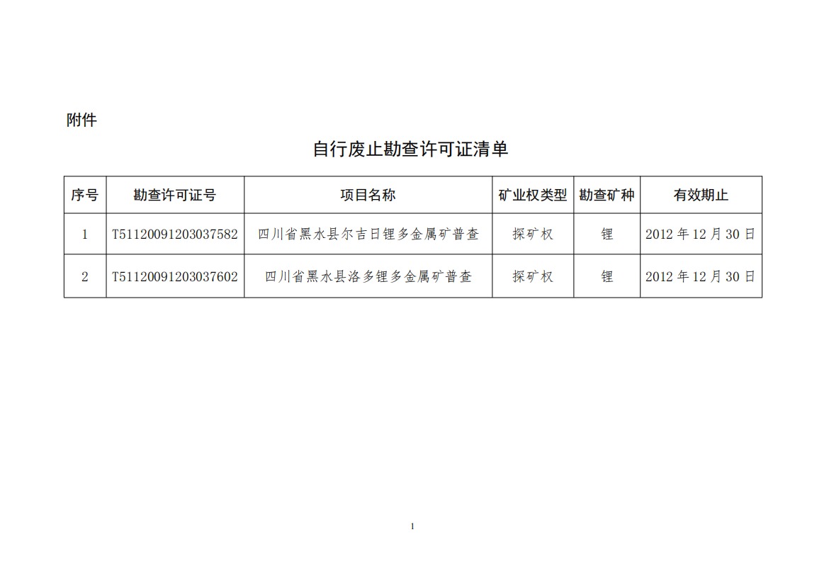 根據《礦產資源勘查區塊登記管理辦法》(國務院令第240號)第十條規定,四川省黑水縣爾吉日鋰多金屬礦普查、四川省黑水縣洛多鋰多金屬礦普查2個勘查許可證在有效期屆滿前,礦業權人未依法申請辦理延續登記手續,勘查許可證自有效期屆滿之日起已自行廢止,現予以公告。
