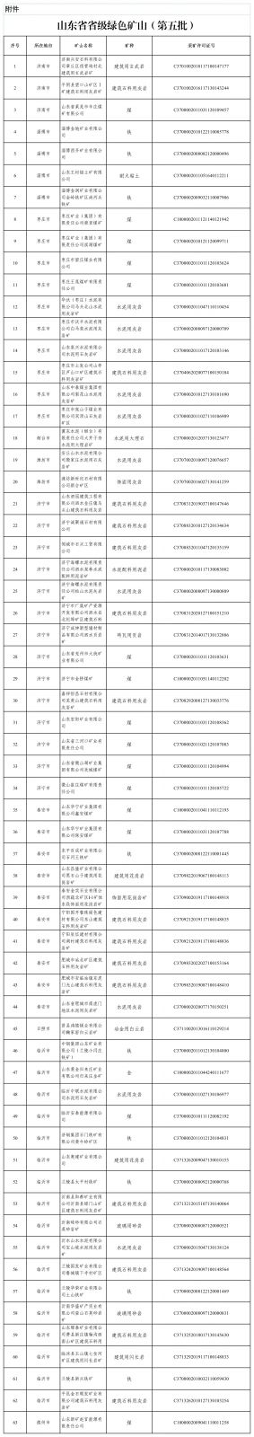 按照《山東省綠色礦山建設管理辦法》(魯自然資規〔2019〕6號)、《關於開展第五批省級綠色礦山遴選工作的通知》(魯自然資字〔2022〕147號)等文件要求,在企業自評,第三方評估,市、縣自然資源等相關部門聯合實地核查和推薦基礎上,經省級實地抽查、省自然資源廳廳長辦公會審議和社會公示,共有63家礦山通過遴選,納入山東省省級綠色礦山名錄(第五批),現予公告。