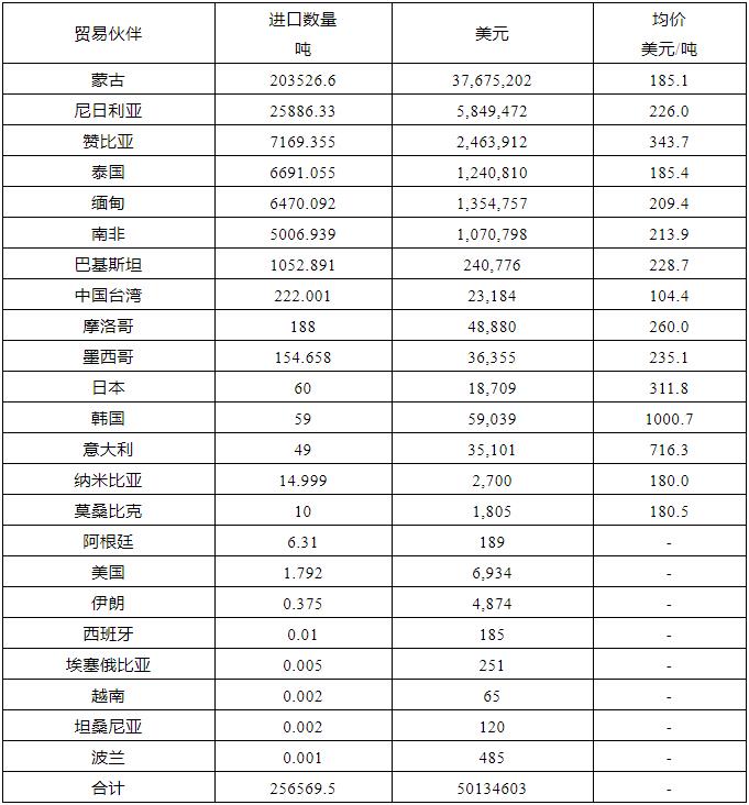 2022年進口氟化鈣含量≤97%的螢石總量約25.66萬噸,進口總額5013.46萬元,主要進口國蒙古占比約4/5。非洲尼日利亞、讚比亞、南非進口數量較靠前。