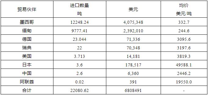 2022年進口氟化鈣含量>97%的螢石總量約2.21萬噸,進口總額約680.85萬元,主要進口國墨西哥占比約55.5%,其次為緬甸。