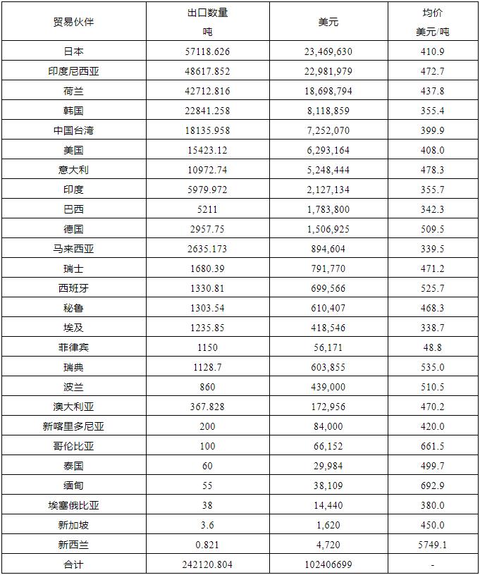 2022年出口氟化鈣含量≤97%的螢石總量約24.21萬噸,出口總額10240.67萬元,主要出口日韓、印尼、荷蘭、中國台灣、美國及意大利。