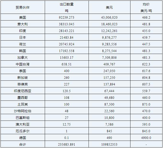 2022年出口氟化鈣含量>97%的螢石總量約23.57萬噸,出口總額約10985.24萬元,主要出口美國,其次為意大利、印度、日本和荷蘭。