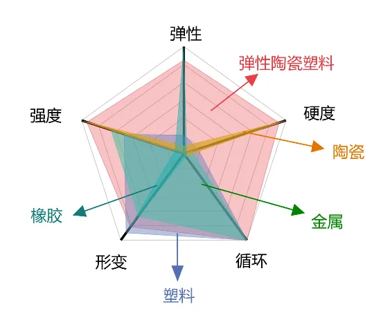 “彈性陶瓷塑料”與其他材料的五項性能對比