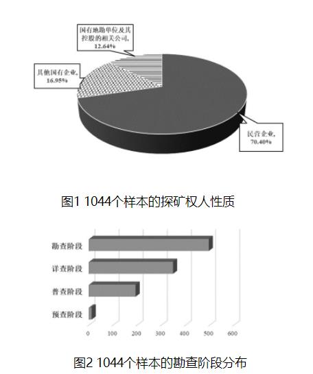抽樣統計的1044個探礦權中,有735個為民營企業(包括民營企業控股的混合企業)持有,占比70.4%;國有地勘單位及其控股的相關公司持有132個;其他國有企業(包含國有控股混合企業)持有177個(見圖1)。這反映出,目前我國大部分探礦權歸屬民營企業。這些民企絕大多數以自然人名義投資,大部分企業規模不大,注冊資本幾十萬元到幾百萬元。投資勘查找礦的民企類型也呈多樣化,樣本中有房地產公司、文化傳媒公司、農業公司、貿易公司、科技公司等,反映出我國礦業仍有很大的投資吸引力,同時也反映出我國礦產勘查並非由專業勘查公司來開展,並缺少西方國家通過證券市場或投資基金來融資的渠道,礦產勘查投資市場體係尚不完善。