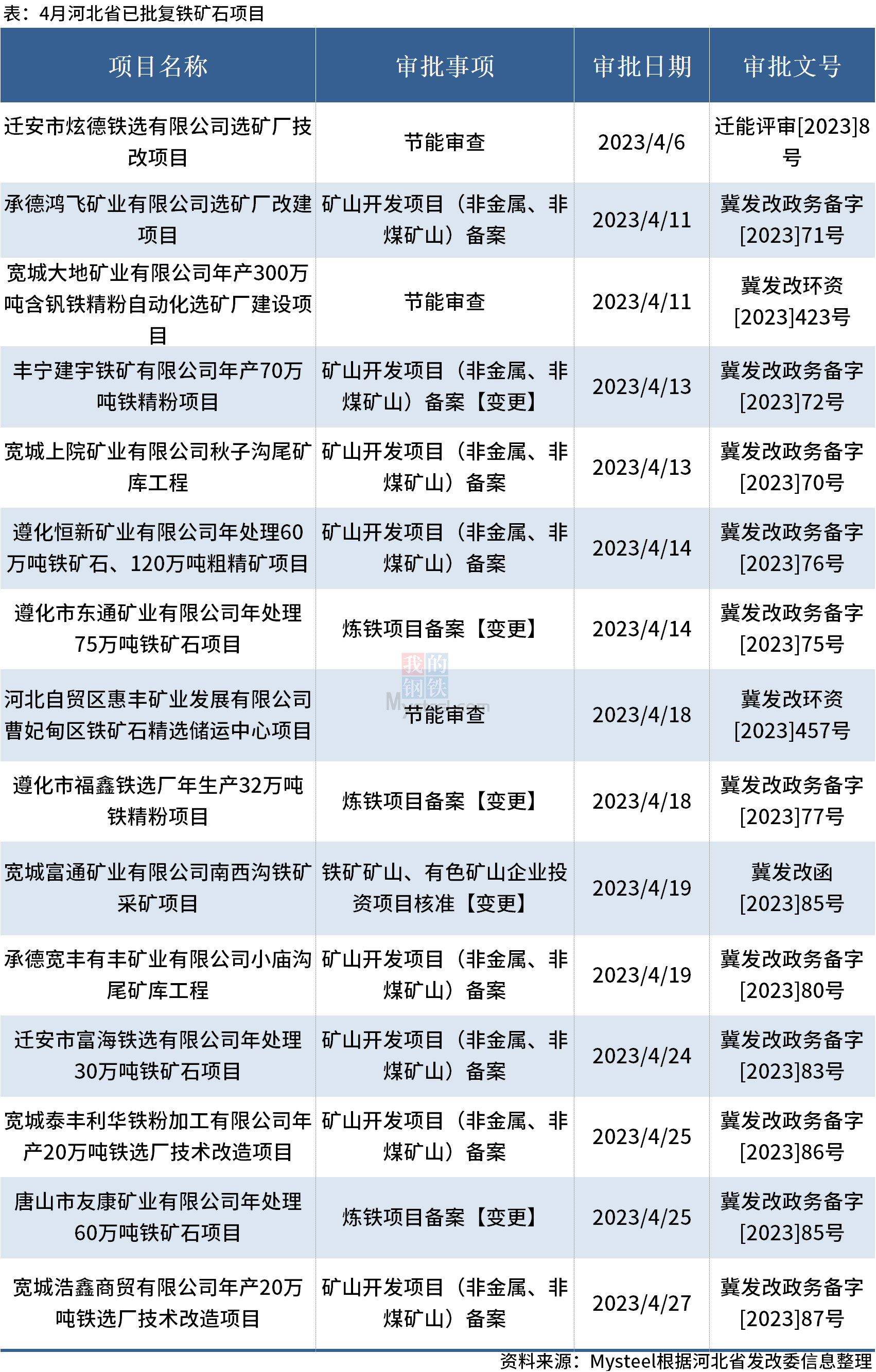據Mysteel不完全統計,2023年4月河北省共批複鐵礦石相關項目15個,分別是8個礦山開發項目(非金屬、非煤礦山)備案【變更】、3個節能審查、1個鐵礦礦山、有色礦山企業投資項目核準【變更】和3個煉鐵項目備案【變更】。