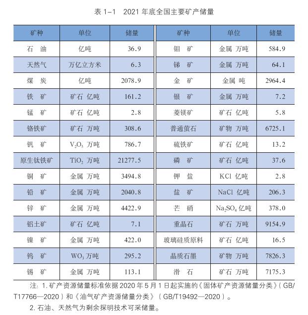《公報》顯示,截至2021年未,全國已發現173種礦產。其中,能源礦產13種,金屬礦產59種,非金屬礦產95種,水氣礦產6種。