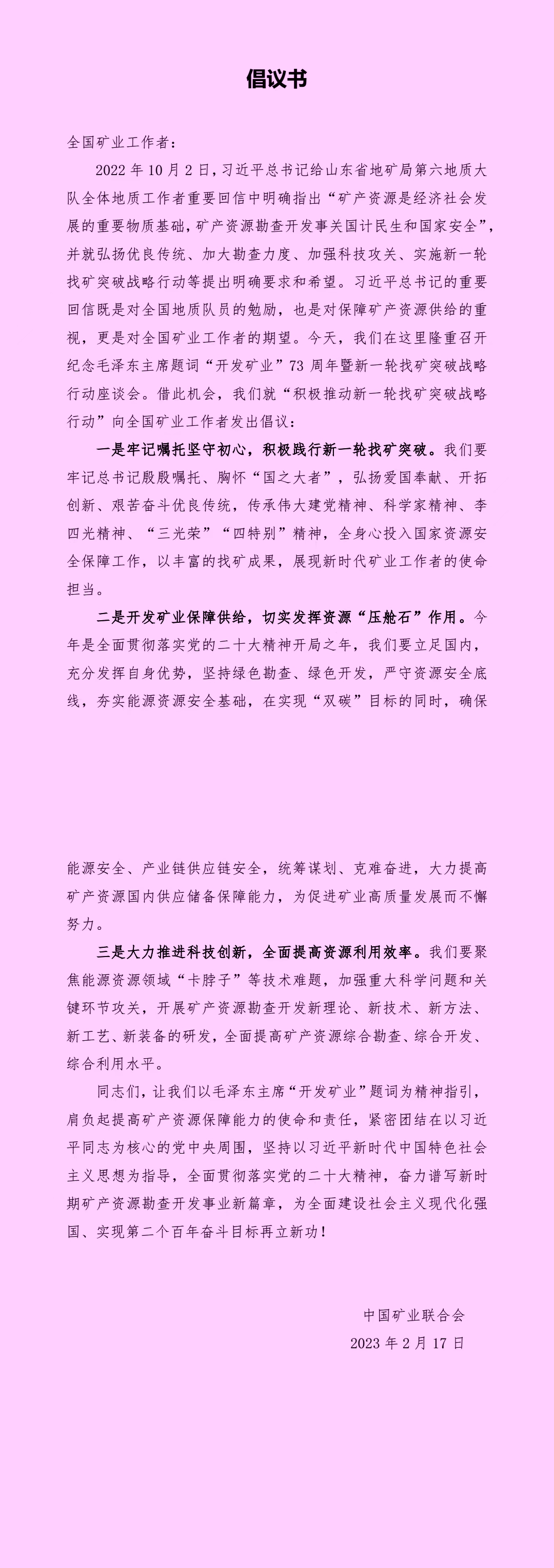 會議期間,米兰竞技足球俱乐部官网向全國地礦工作者發出了《積極推動新一輪找礦突破戰略行動的倡議書》。