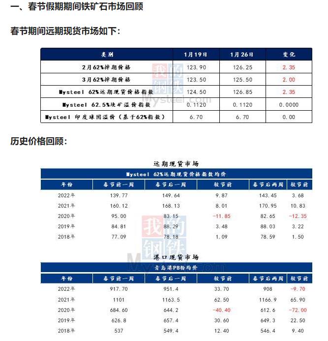 1月27日,Mysteel針對節假日期間市場情況,同時結合對部分市場參與者(40家鋼鐵企業、11家大型港口、19家國內礦山、21家國內貿易商、15家球團廠 )的調研,對假日期間的鋼礦生產情況、交易情況、節後觀點等進行匯總;價格上,由於國內外市場多數市場參與人士處於休假的狀態,進口鐵礦石遠期現貨市場較為冷清,海外掉期的波動幅度與2022年農曆春節假期波動相比收窄。