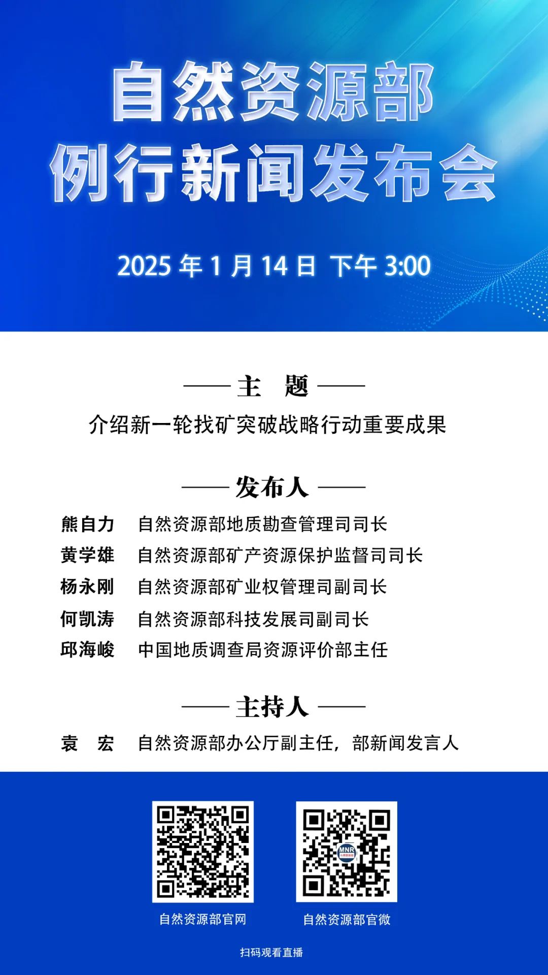 1月14日下午3:00!自然資源部舉行例行新聞發布會——介紹新一輪找礦突破戰略行動重要成果