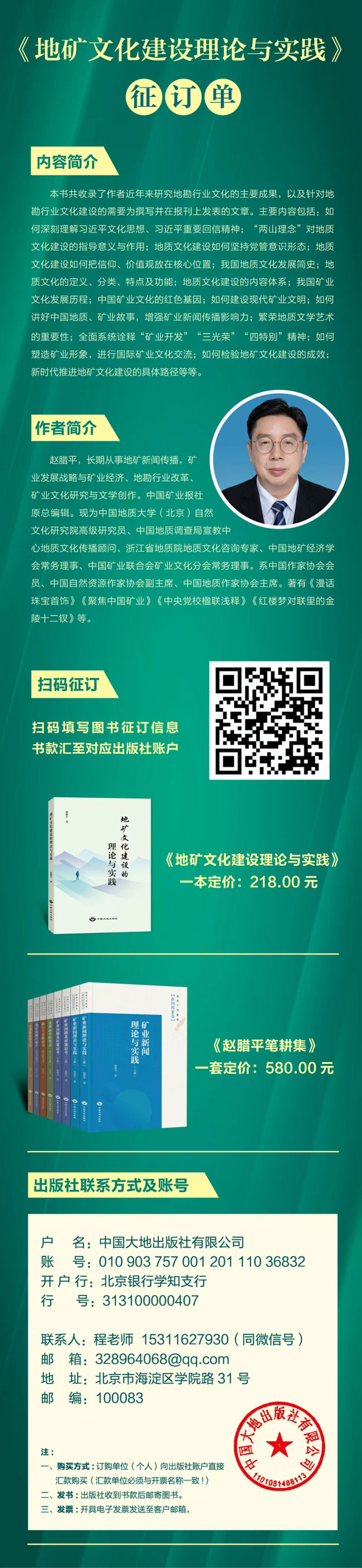 這本書(shu) 的主要內(nei) 容包括:習(xi) 近平文化思想、習(xi) 近平重要回信精神及“兩(liang) 山理念”對地質文化建設的指導意義(yi) 與(yu) 作用;地質文化建設如何堅持黨(dang) 管意識形態;地質文化建設如何把信仰、價(jia) 值觀放在核心位置;我國地質文化發展簡史、地質精神與(yu) 地質優(you) 良傳(chuan) 統;地質文化的定義(yi) 、分類及內(nei) 容體(ti) 係;我國礦業(ye) 文化發展曆程及紅色基因;如何建設現代礦業(ye) 文明;如何講好中國地質、礦業(ye) 故事,增強礦業(ye) 新聞傳(chuan) 播影響力;繁榮地質文學藝術的重要性;全麵係統詮釋“礦業(ye) 開發”、“三光榮”“四特別”精神;如何塑造礦業(ye) 形象,進行國際礦業(ye) 文化交流;對新時代如何進一步加強地質、礦業(ye) 文化建設提出了建議。