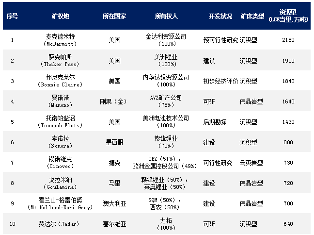 根據總資源量(LCE,碳酸鋰當量,萬噸,以下同),Mining Intelligence網站列出了世界前十大粘土和硬岩鋰礦。