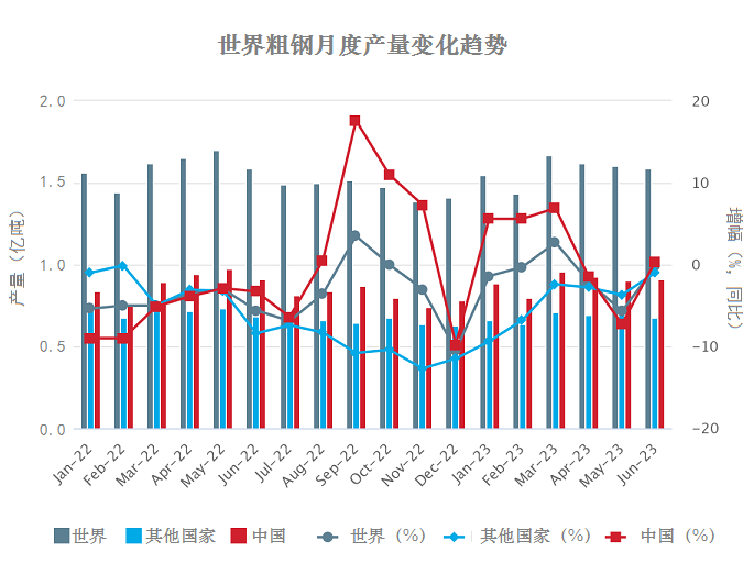 據世界鋼鐵協會(Worldsteel)對63個國家的統計,6月份,世界粗鋼產量為1.588億噸,同比下降0.1%。上半年產量為9.439億噸,下降1.1%。