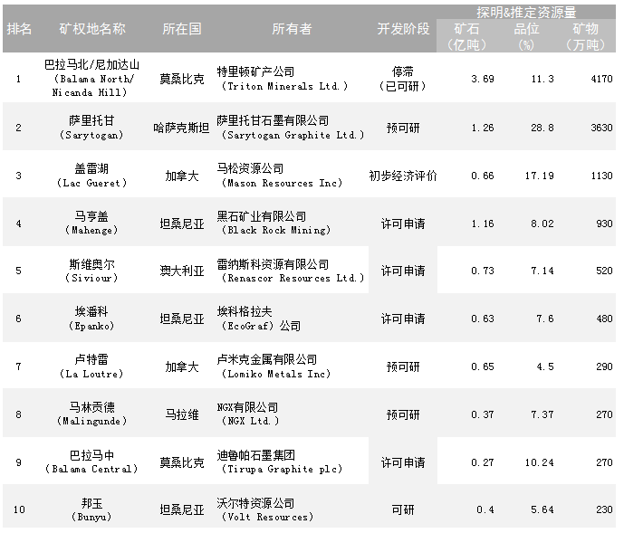 根據所含石墨礦物量,礦業情報(Mining Intelligence)網站列出了世界十大石墨項目,多分布在非洲。