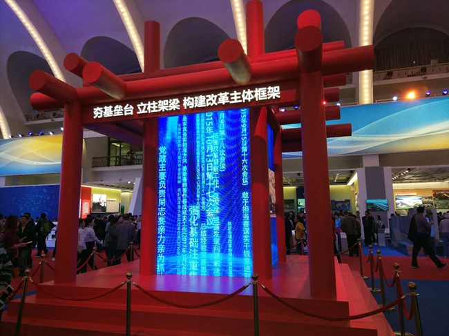 “砥礪奮進的五年”大型成就展以習近平總書記係列重要講話精神和黨中央治國理政新理念新思想新戰略為主線,充分運用圖片、視頻、實物、模型等多種形式,集中展示了黨的十八大以來,以習近平同誌為核心的黨中央統攬全局、科學決策,團結帶領全國各族人民在經濟建設、政治建設、文化建設、社會建設、生態文明建設、國防和軍隊建設等各個方麵取得的舉世矚目的偉大成就。展覽包括10個主題展區和1個特色體驗展區。此次大型成就展由中央宣傳部、國家發展改革委、中央軍委政治工作部和北京市委共同舉辦。