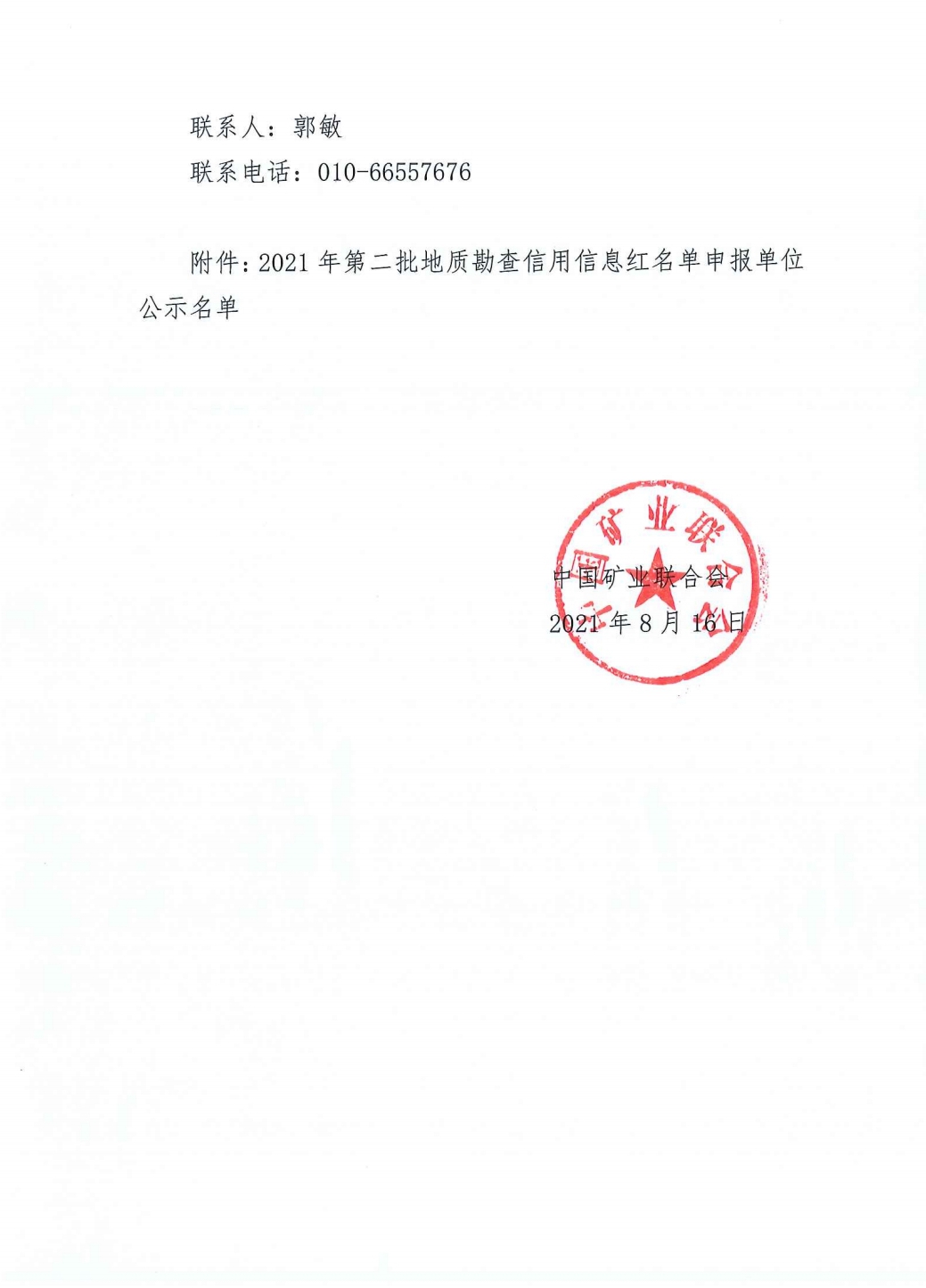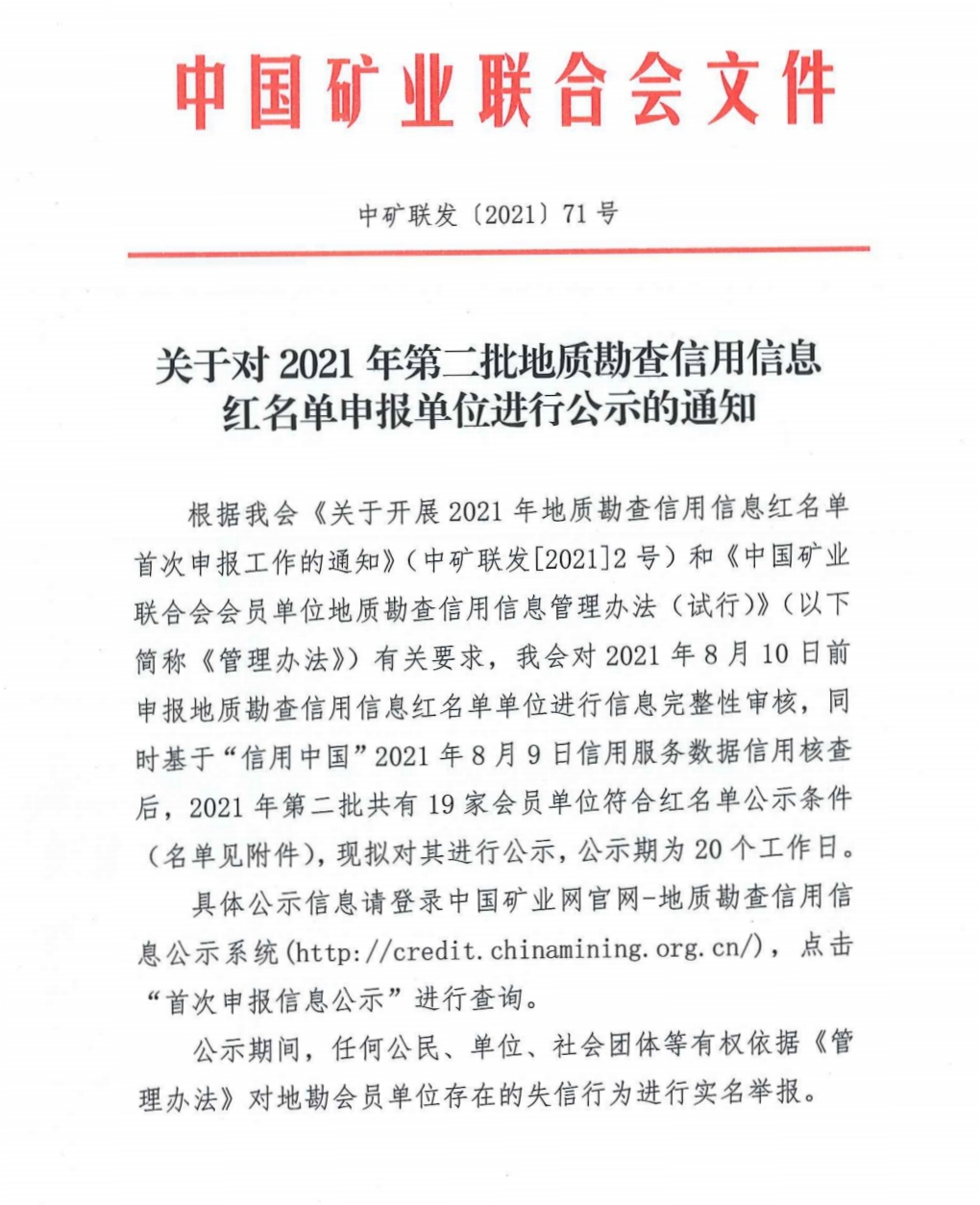 根據我會《關於開展2021年地質勘查信用信息紅名單首次申報工作的通知》(中礦聯發[2021]2號)和《米兰竞技足球俱乐部官网會員單位地質勘查信用信息管理辦法(試行)》(以下簡稱《管理辦法》)有關要求,我會對2021年8月10日前申報地質勘查信用信息紅名單單位進行信息完整性審核,同時基於“信用中國”2021年8月9日信用服務數據信用核查後,2021年第二批共有19家會員單位符合紅名單公示條件(名單見附件),現擬對其進行公示,公示期為20個工作日。