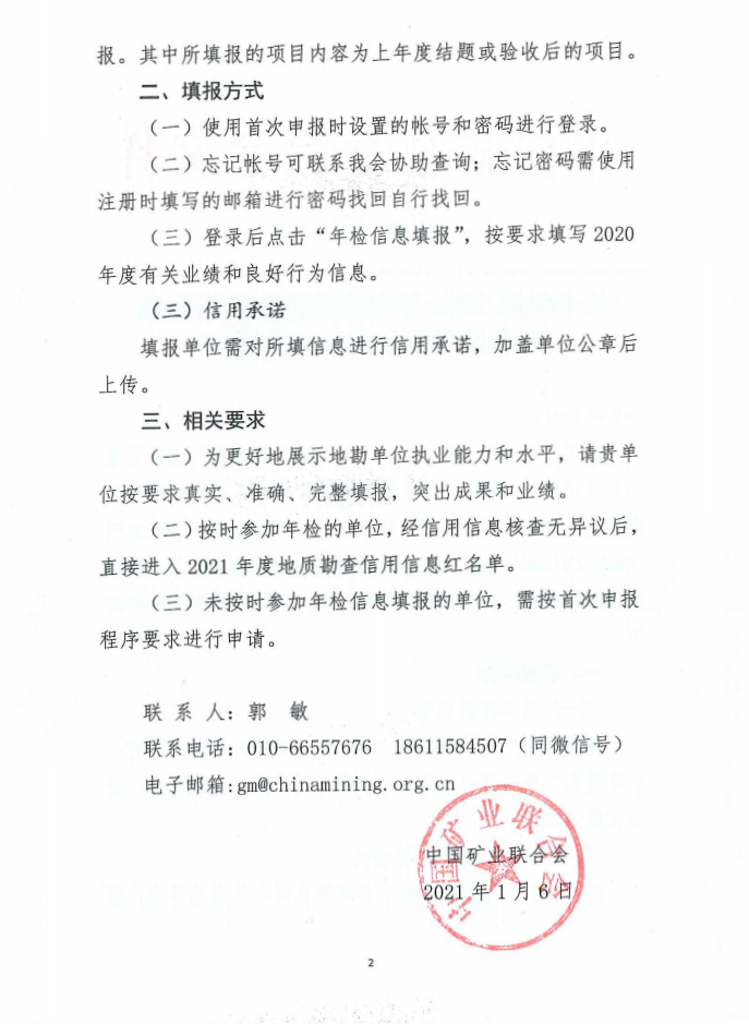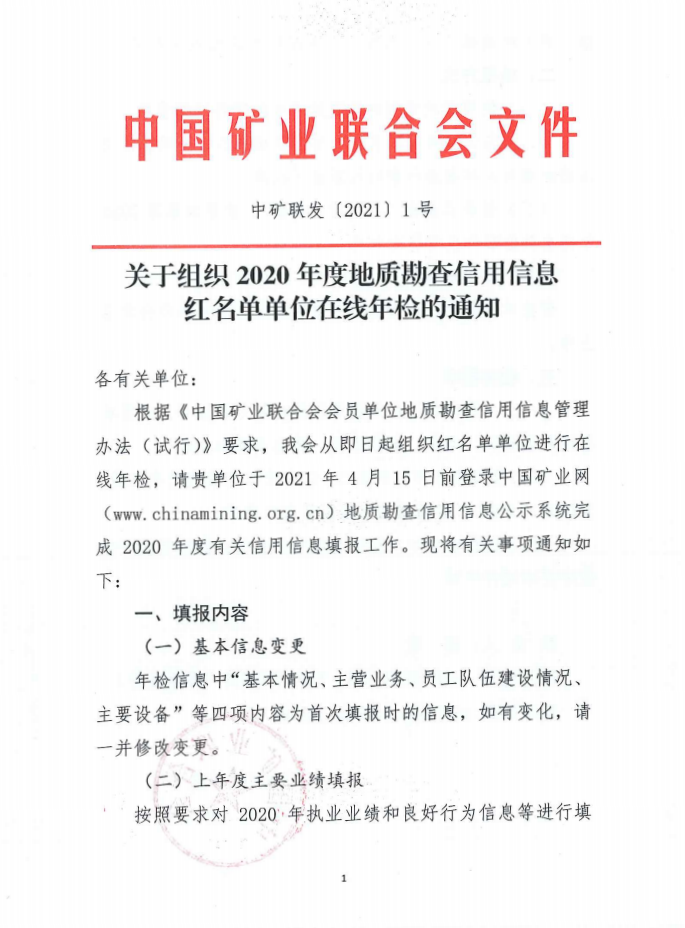根據《米兰竞技足球俱乐部官网會員單位地質勘查信用信息管理辦法(試行)》要求,我會從即日起組織紅名單單位進行在線年檢,請貴單位於2021年4月15日前登錄米兰体育官方网页(www.jiahuayixiao.com)地質勘查信用信息公示係統完成2020年度有關信用信息填報工作。