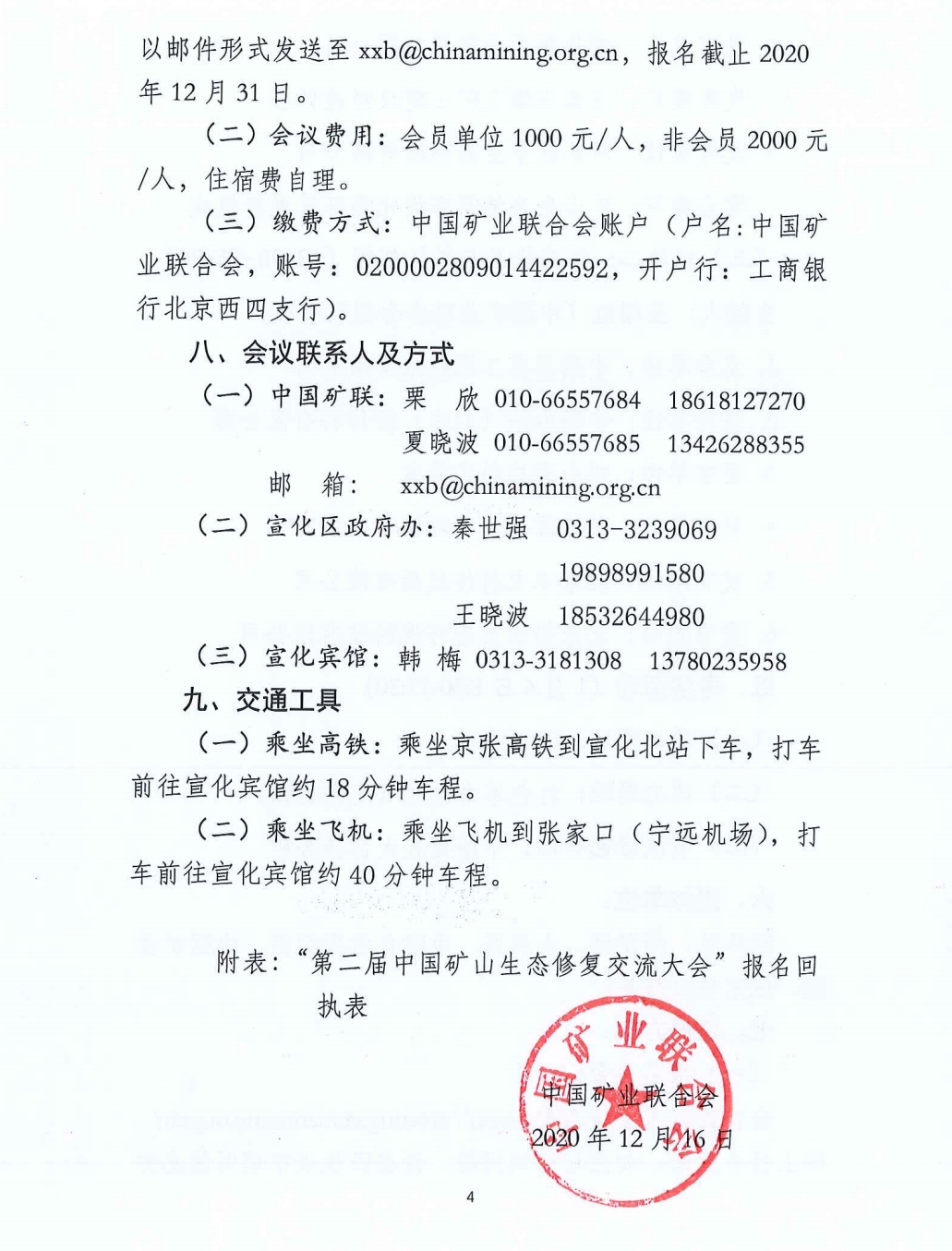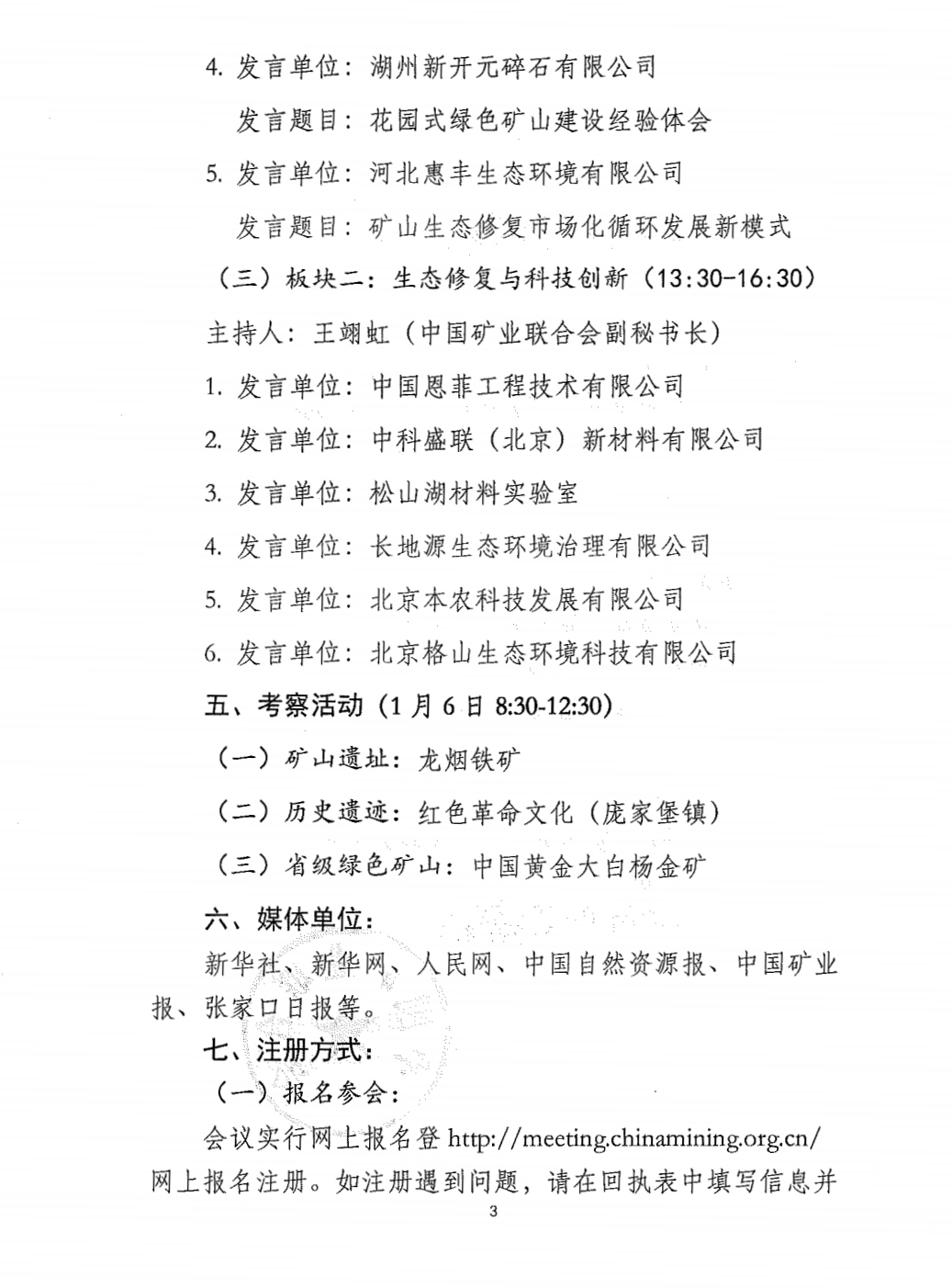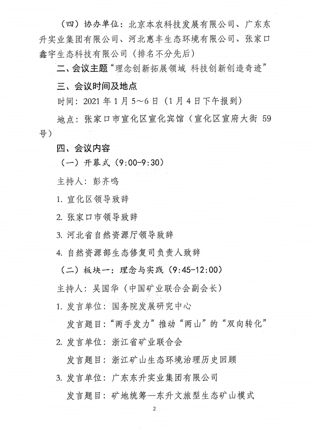 為深入踐行習近平總書記生態文明思想,全麵推動我國礦業綠色高質量發展,提高礦產資源節約和綜合利用水平,米兰竞技足球俱乐部官网定於2021年1月5~6日,在河北省張家口市宣化區舉辦“第二屆中國礦山生態修複交流大會”,大會重點圍繞資源綜合利用、節能減排、地質環境治理與生態修複等方麵的前沿技術與成果轉化進行交流研討;分享綠色礦山建設以及礦山生態修複的發展脈絡、實現路徑、先進經驗,現場破解2022北京冬奧會張家口賽區周邊區域礦山生態修複難題。現將有關事項通知如下: