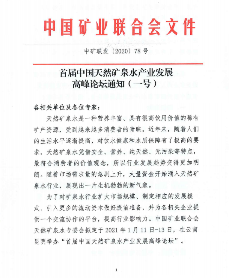 首屆中國天然礦泉水產業發展高峰論壇通知(一號)