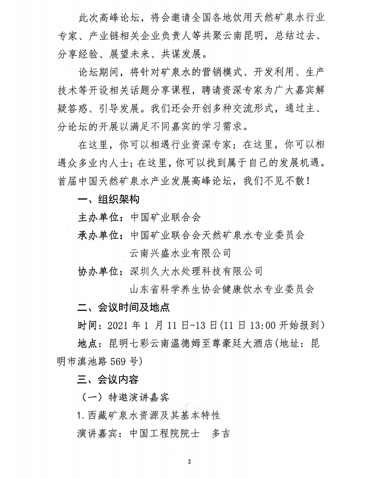 為了對礦泉水行業擴大市場規模、製定相應的發展模式、引入更多的流動資本做好提前準備,並為各相關企業提供一個交流協作的平台,提高行業影響力。米兰竞技足球俱乐部官网天然礦泉水專委會擬定於2021年1月11日-13日,在雲南昆明舉辦“首屆中國天然礦泉水產業發展高峰論壇”。