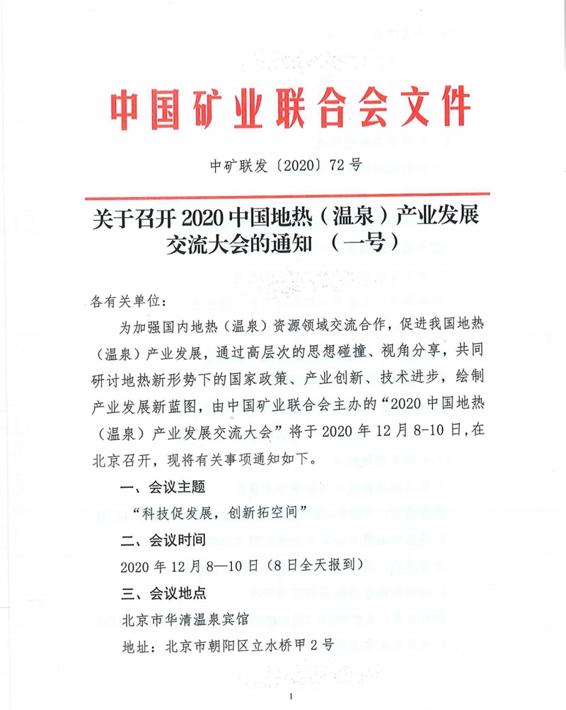 關於召開2020中國地熱(溫泉)產業發展交流大會的通知 (一號)