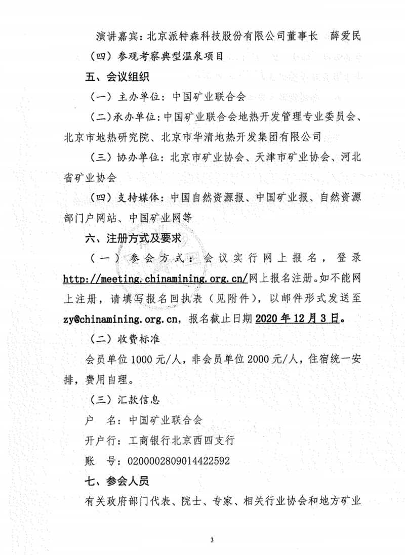 為加強國內地熱(溫泉)資源領域交流合作,促進我國地熱(溫泉)產業發展,通過高層次的思想碰撞、視角分享,共同研討地熱新形勢下的國家政策、產業創新、技術進步,繪製產業發展新藍圖,由米兰竞技足球俱乐部官网主辦的“2020中國地熱(溫泉)產業發展交流大會”將於2020年12月8-10日,在北京召開,現將有關事項通知如下: