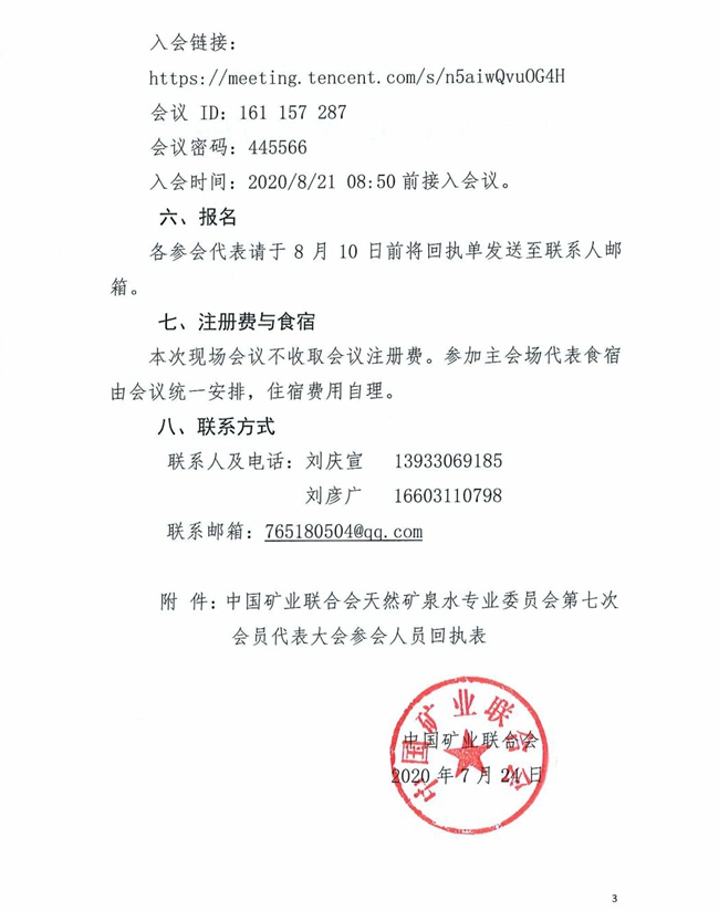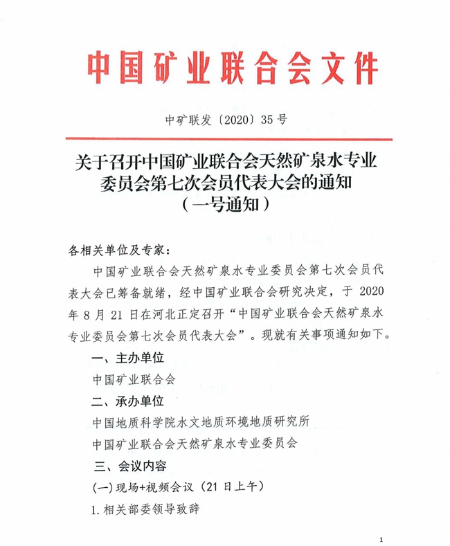 米兰竞技足球俱乐部官网天然礦泉水專業委員會第七次會員代表大會已籌備就緒,經米兰竞技足球俱乐部官网研究決定,於2020年8月21日在河北正定召開“米兰竞技足球俱乐部官网天然礦泉水專業委員會第七次會員代表大會”。現就有關事項通知如下。