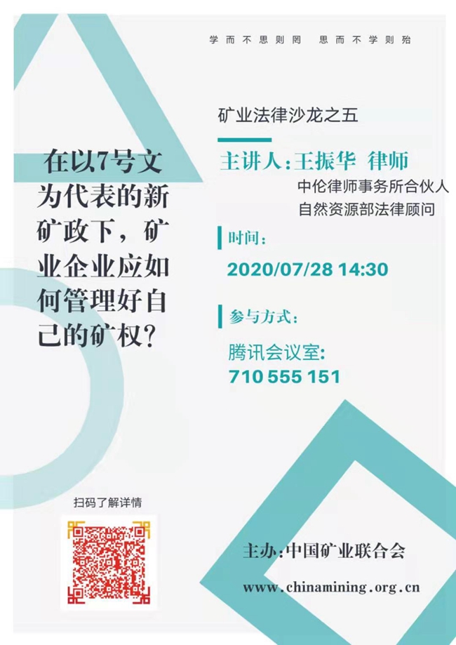 由米兰竞技足球俱乐部官网主辦,法律專業委員會承辦的礦業法律沙龍係列講座之五“在以7號文為代表的新礦政下礦業企業應如何管理好自己的礦權?”將於2020年7月28日下午兩點半準時開講。本次沙龍我們邀請中倫律師事務所合夥人、自然資源部法律顧問王振華女士為大家講課。