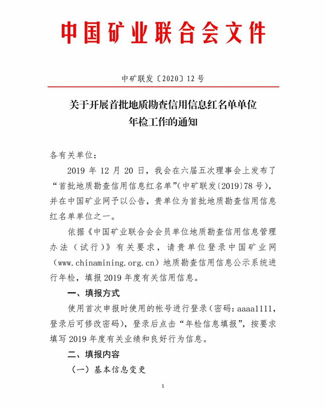 2019 年12 月20 日,我會在六屆五次理事會上發布了“首批地質勘查信用信息紅名單”(中礦聯發〔2019〕78 號),並在米兰体育官方网页予以公告,貴單位為首批地質勘查信用信息紅名單單位之一。
