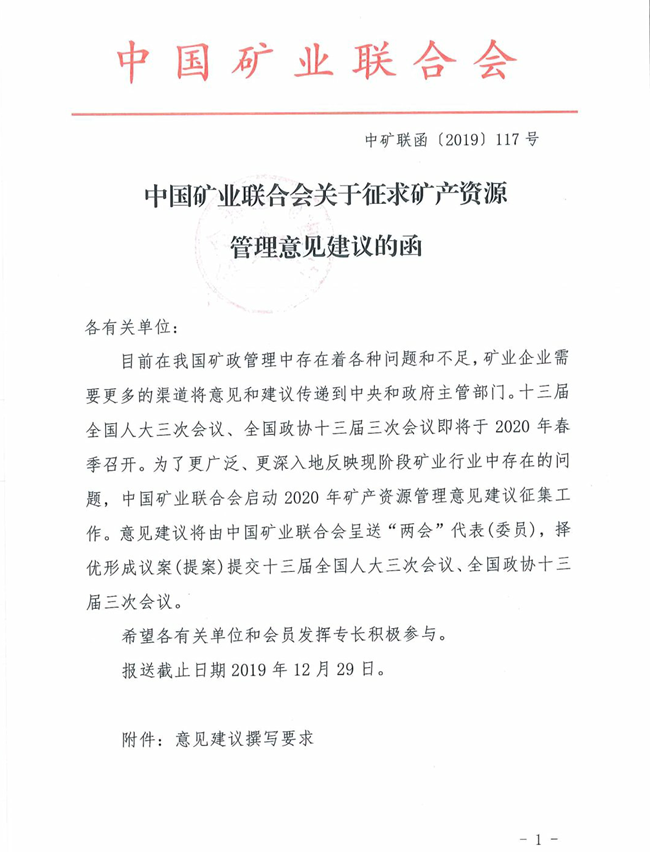 目前在我國礦政管理中存在著各種問題和不足,礦業企業需要更多的渠道將意見和建議傳遞到中央和政府主管部門。十三屆全國人大三次會議、全國政協十三屆三次會議即將於2020年春季召開。為了更廣泛、更深入地反映現階段礦業行業中存在的問題,米兰竞技足球俱乐部官网啟動2020年礦產資源管理意見建議征集工作。意見建議將由米兰竞技足球俱乐部官网呈送“兩會”代表(委員),擇優形成議案(提案)提交十三屆全國人大三次會議、全國政協十三屆三次會議。