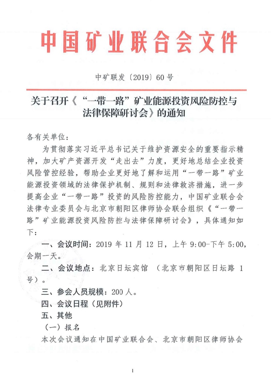 為貫徹落實習近平總書記關於維護資源安全的重要指示精神,加大礦產資源開發“走出去”力度,更好地總結企業投資風險管控經驗,幫助企業更好地了解和運用“一帶一路”礦業能源投資領域的法律保護機製、規則和法律救濟措施,進一步提高企業“一帶一路”投資的風險防控能力,米兰竞技足球俱乐部官网法律專業委員會與北京市朝陽區律師協會聯合組織《“一帶一路”礦業能源投資風險防控與法律保障研討會》,具體通知如下: