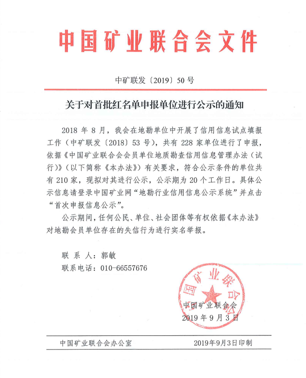 2018年8月,我會在地勘單位中開展了信用信息試點填報工作(中礦聯發〔2018〕53號),共有228家單位進行了申報,依據《米兰竞技足球俱乐部官网會員單位地質勘查信用信息管理辦法(試行)》(以下簡稱《本辦法》)有關要求,符合公示條件的單位共有210家,現擬對其進行公示,公示期為20個工作日。具體公示信息請登錄米兰体育官方网页“地勘行業信用信息公示係統”並點擊“首次申報信息公示”。
