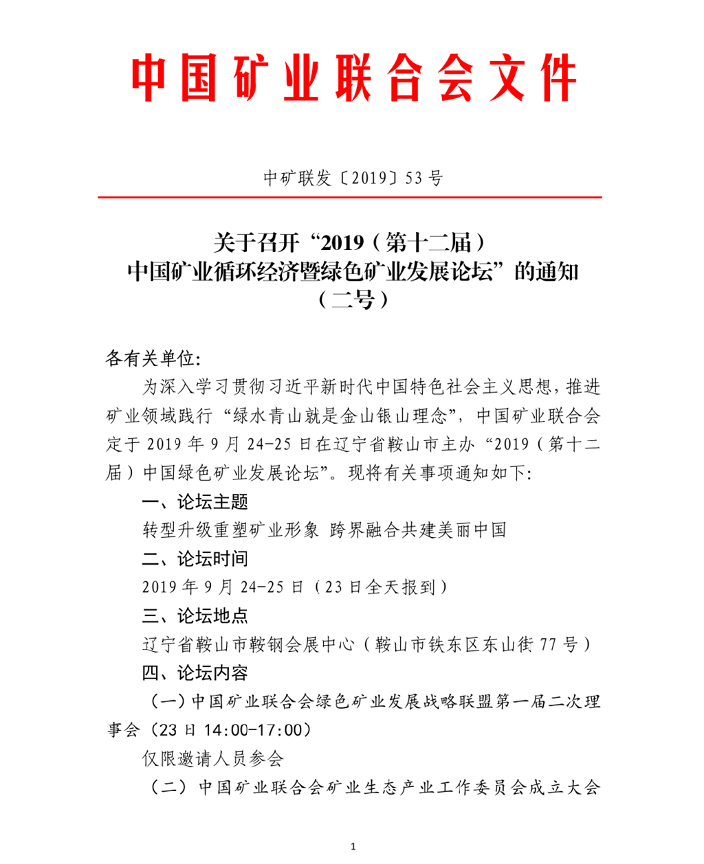 關於召開“2019(第十二屆)中國礦業循環經濟暨綠色礦業發展論壇”的通知(二號)