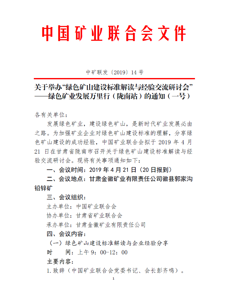 關於舉辦“綠色礦山建設標準解讀與經驗交流研討會” --綠色礦業發展萬裏行(隴南站)的通知(一號