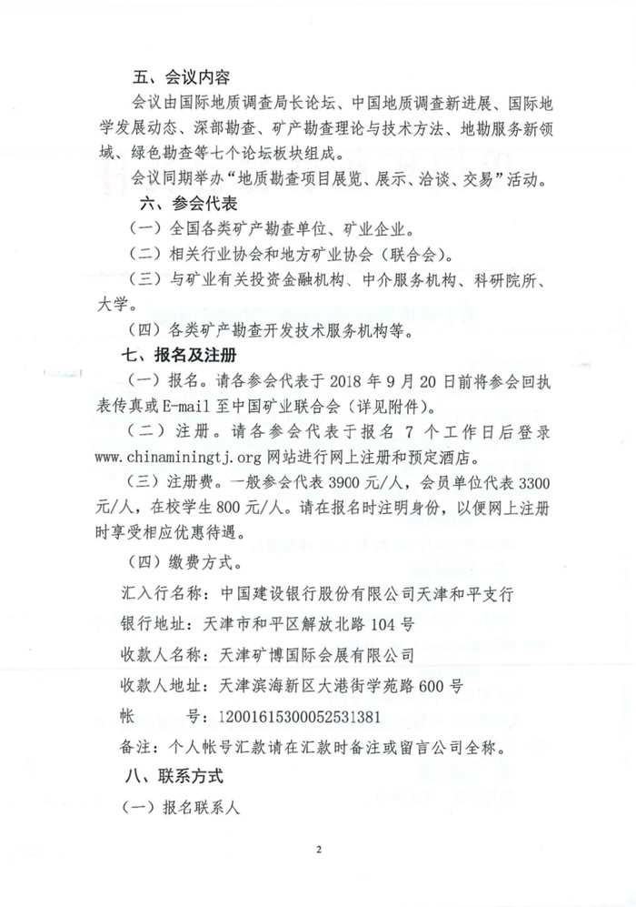為了貫徹落實新時代地質工作的新任務、新使命,進一步加強礦產勘查開發領域的交流合作,促進我國礦業經濟健康可持續發展,米兰竞技足球俱乐部官网擬在天津召開2018中國探礦者年會,本次會議與2018中國(第二十屆)國際礦業大會同期舉行。