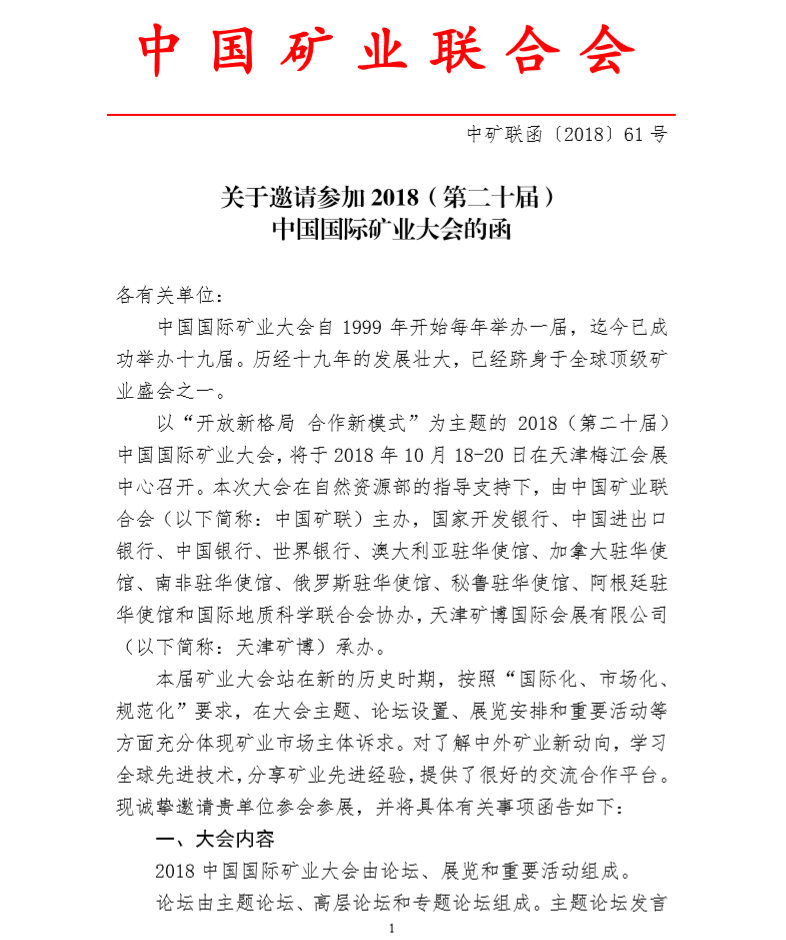 關於邀請參加2018(第二十屆)中國國際礦業大會的函